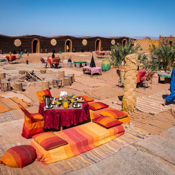 As night falls, arrive at a traditional Berber camp where you’ll enjoy a delicious dinner under the stars. End the day with lively Berber music and storytelling around a campfire, and sleep in a comfortable desert tent.